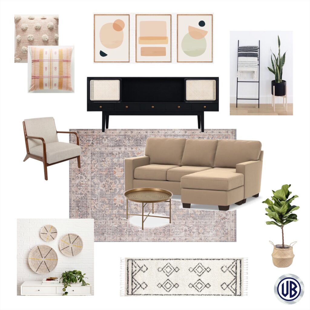 Thank goodness for e-design! With more time being spent at home and the need to distance, e-design is a great way to make updates to your space (and on a budget, if needed). I’m happy to share a recently completed modern bohemian living room e-design. This client just moved into a beautiful, newly built apartment and had some furniture, but needed help completing the space. Here’s a look at some of the items we selected!
