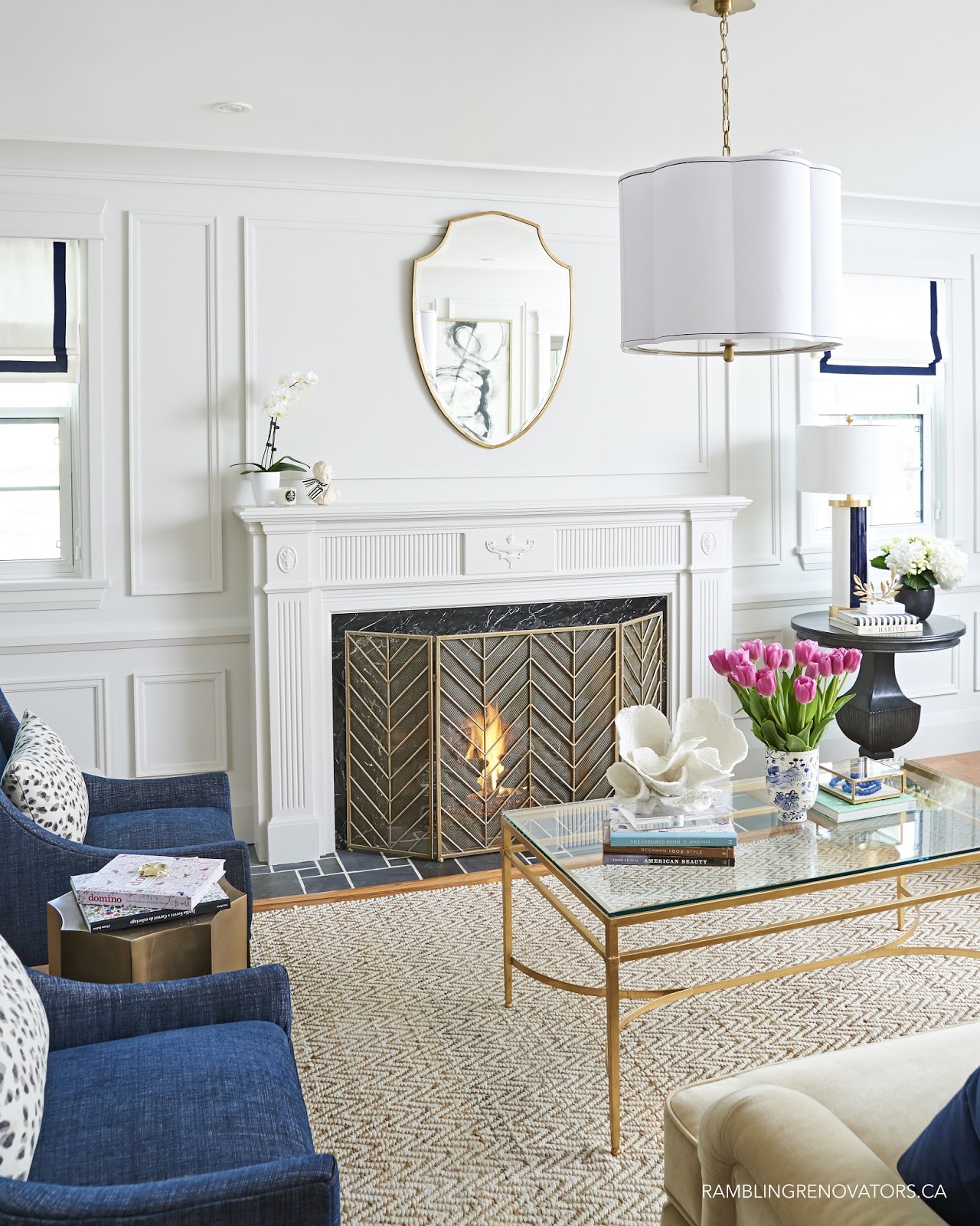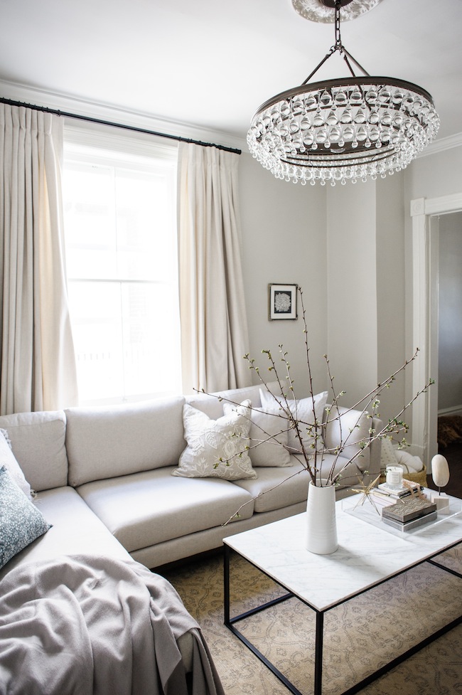 Their goal was to create a sanctuary, and they really did in this casual yet elegant living room. This is one of my favorite chandeliers too!